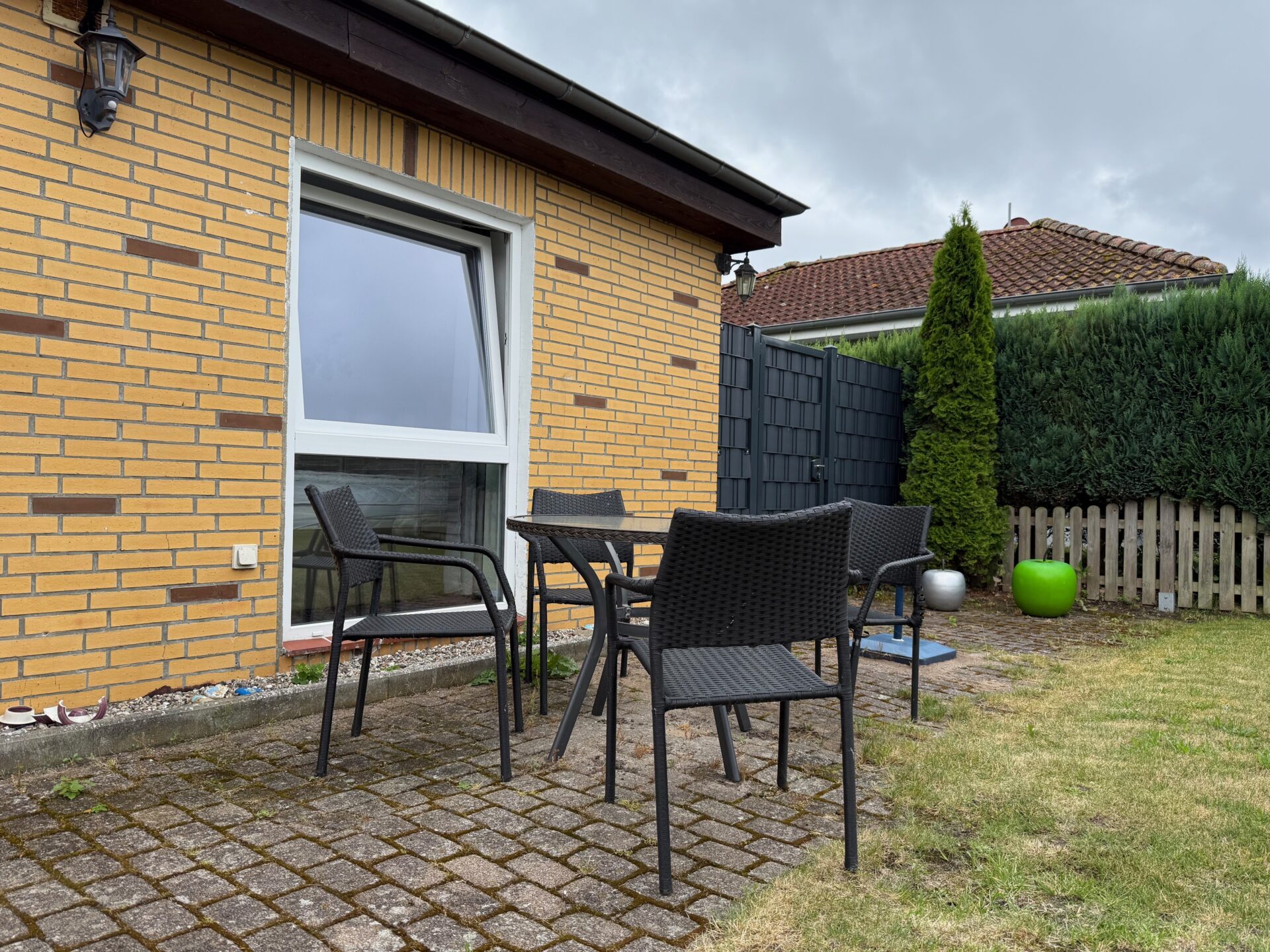 Die Strandoase hat einen separat eingezäunten Garten mit Gartenmöbeln, Grill, Sonnenschirm und Sonnenliege.